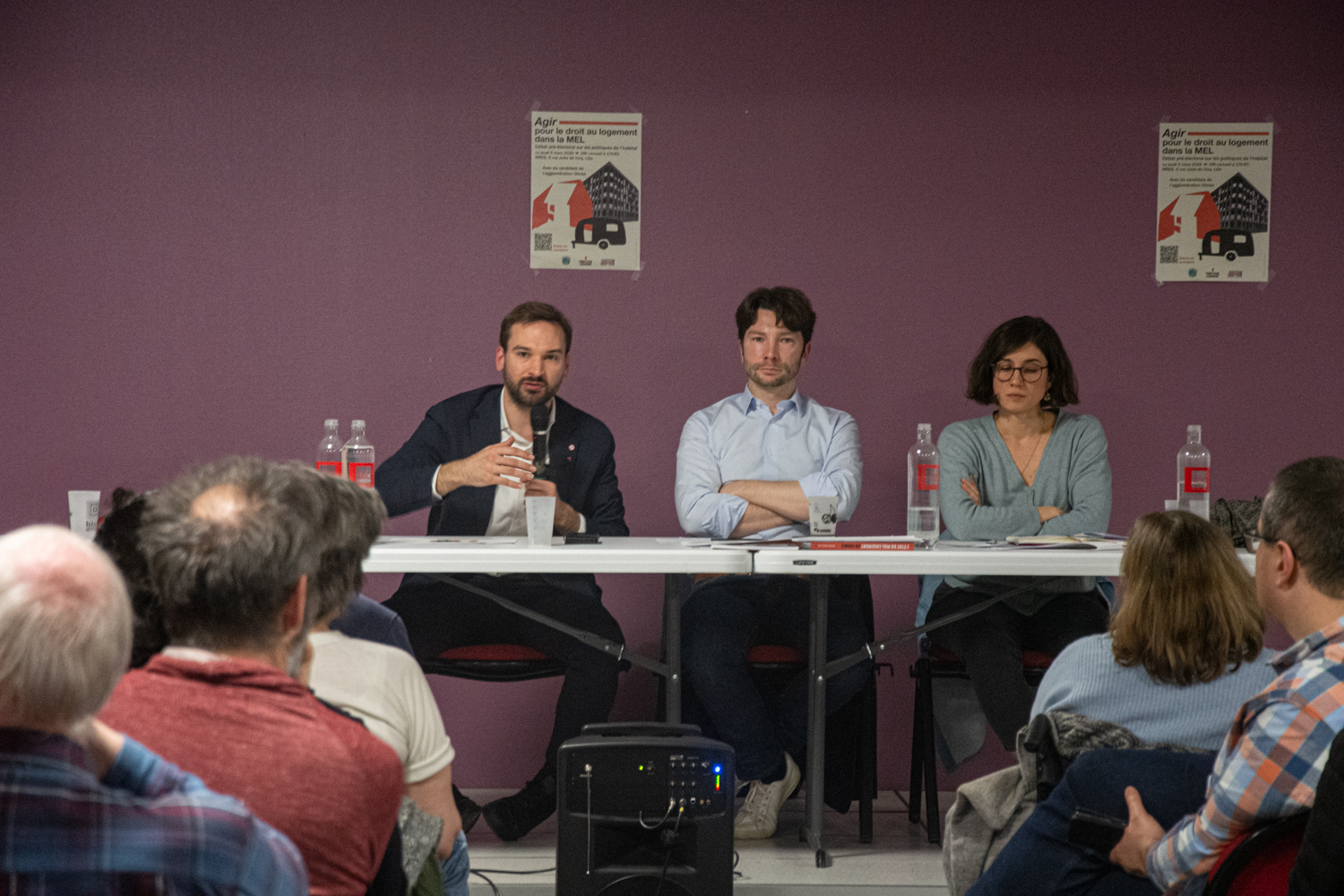 Ugo Bernalicis (LFI), Victor Burette (PS) et Pauline Ségard (Les Verts) lors d'un débat sur le droit au logement digne dans la MEL le 6 mars 2026. Photo : Matthieu Slisse / Mediacités