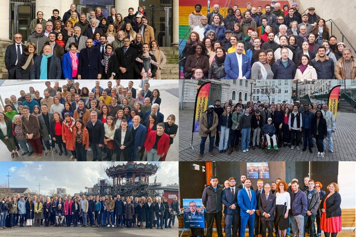 Les six principales listes nantaises aux élections municipales de mars 2026. Montage : Anouck Fily / Mediacités
