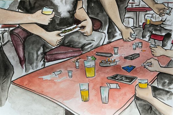Consommation d’alcool et de drogues, une fois le rideau d’un bar fermé. Dessin : Ana Pich