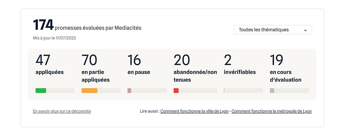 À cette page, vous trouverez les 174 promesses recensées (huit promesses « phares » mises en avant puis l’ensemble dans un damier à dérouler). Des menus déroulants (« thématiques » ; « statuts ») vous permettent d’afficher les promesses par catégorie. Vous pouvez aussi les distinguer entre celles qui relèvent des compétences de la Métropole et celles des compétences de la ville de Lyon.