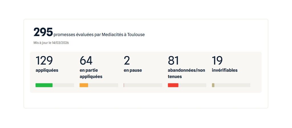 Envie d’en savoir plus ? Allez jeter un œil à Radar 2026, l’outil de suivi de suivi des promesses électorales mis au point par Mediacités (avec l’aide de WeDoData et le soutien du Fonds pour une presse libre). Nous avions scrupuleusement noté tous les engagements pris lors de la campagne de 2020 et nous les avons évalués un par un. Un gros travail riche d’enseignements dont vous découvrirez le résultat ici :