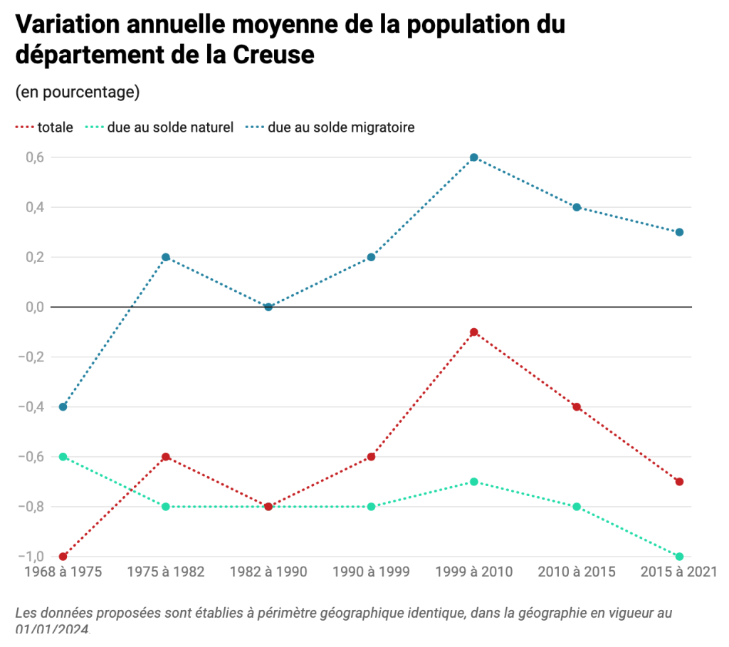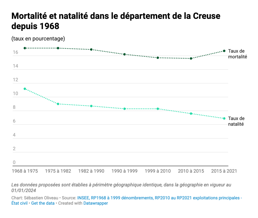Le cas du département de la Creuse est l’exemple le plus marquant. Le département a connu son pic de population en 1886, avec presque 285 000 habitants. Depuis, il s’est littéralement vidé. Il a d’abord été victime de l’exode rural, mais, depuis 1975, le solde migratoire est positif. C’est donc depuis lors la panne de la dynamique naturelle qui explique la décroissance démographique de la Creuse. Le solde naturel atteint en effet presque – 1 % par an désormais (un record en France). On y dénombre deux fois et demie plus de décès que de naissances, et l’année 2024 a été marquée par seulement 713 naissances, deux fois moins que dans les années 1970.