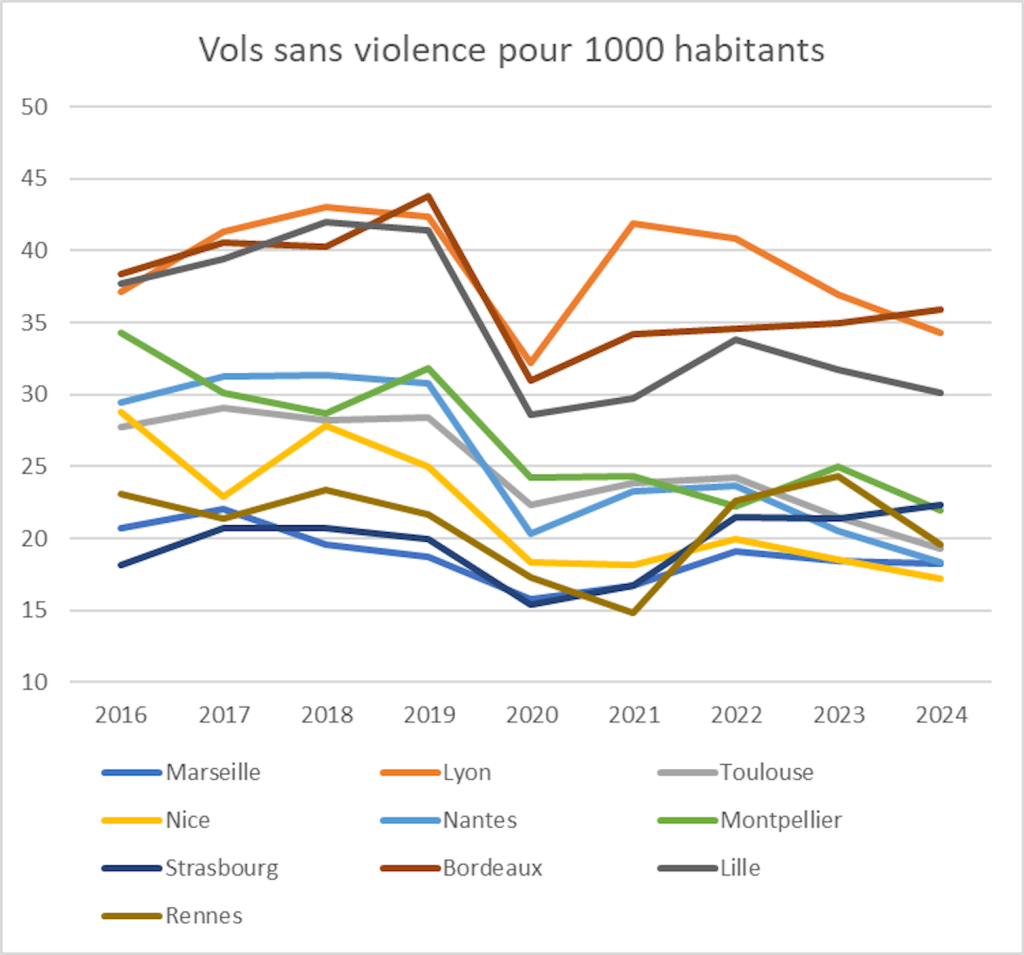 Si l’on observe les plus grandes villes françaises après Paris, les plus fortes hausses d’effectifs de police municipale ne se font pas postérieurement à des augmentations locales d’infractions. À Toulouse, une nouvelle vague d’augmentation des effectifs a lieu après 2020 (de 330 agents cette année à 380 en 2023), alors que la période préconfinement était marquée dans la ville par une baisse des vols avec et sans violence. Nantes, quant à elle, a une délinquance enregistrée plus représentative des dix plus grandes villes françaises : une faible augmentation de différents faits dans les années pré‐Covid, un coup d’arrêt porté en 2020 par les mesures de confinement et de restriction de liberté, puis la reprise à partir de 2021 à des niveaux moindres que précédemment. La police municipale y connaît pourtant une forte hausse des effectifs, d’une centaine en 2020 à plus de 160 en 2023.