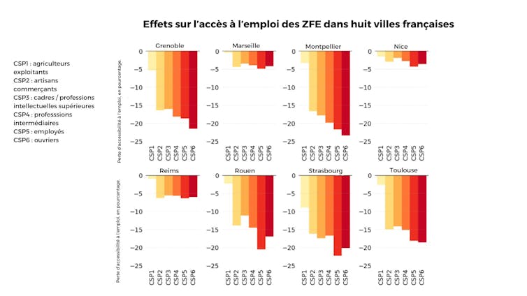 De fait, après la mise en place de la ZFE, certains trajets domicile‐emploi deviennent plus longs, car le domicile ou l’emploi sont situés dans la ZFE, car le ménage possède un véhicule polluant, et, car l’alternative en transport en commun ou à pied est plus longue. En termes d’inégalités, les plus impactés sont les employés et les ouvriers (CSP5 et CSP6), dans six des huit villes : Grenoble, Montpellier, Rouen, Strasbourg, Nice, et Toulouse.