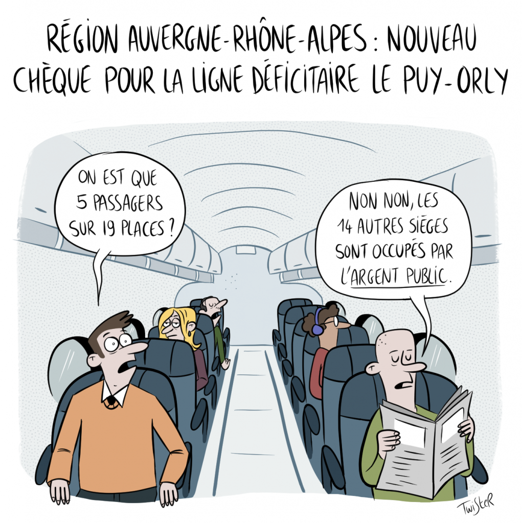Mordant, décalé et toujours drôle. Chaque semaine, la dessinatrice Twister pose son regard sur une publication de Mediacités. Cette fois-ci : nos révélations sur la rallonge financière accordée par la région Auvergne-Rhône-Alpes à la ligne aérienne entre Paris Orly et Le Puy-en-Velay, fief d'un certain Laurent Wauquiez.