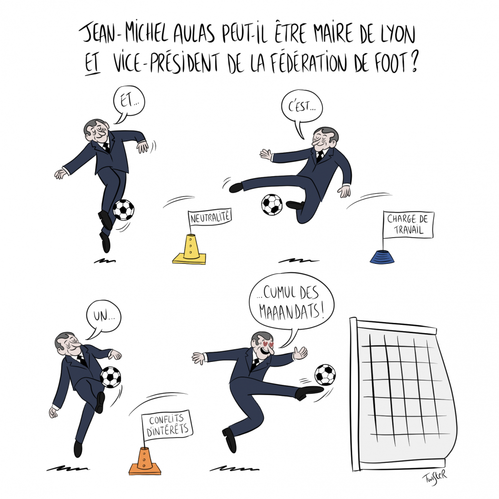 Mordant, décalé et toujours drôle. Chaque semaine, la dessinatrice Twister pose son regard sur une publication de Mediacités. Cette fois-ci : notre article « Veracités » (la rubrique fact-checking de notre journal) sur l'aspiration de Jean-Michel Aulas à rester vice-président de la Fédération française de football en cas de victoire à l'élection municipale.