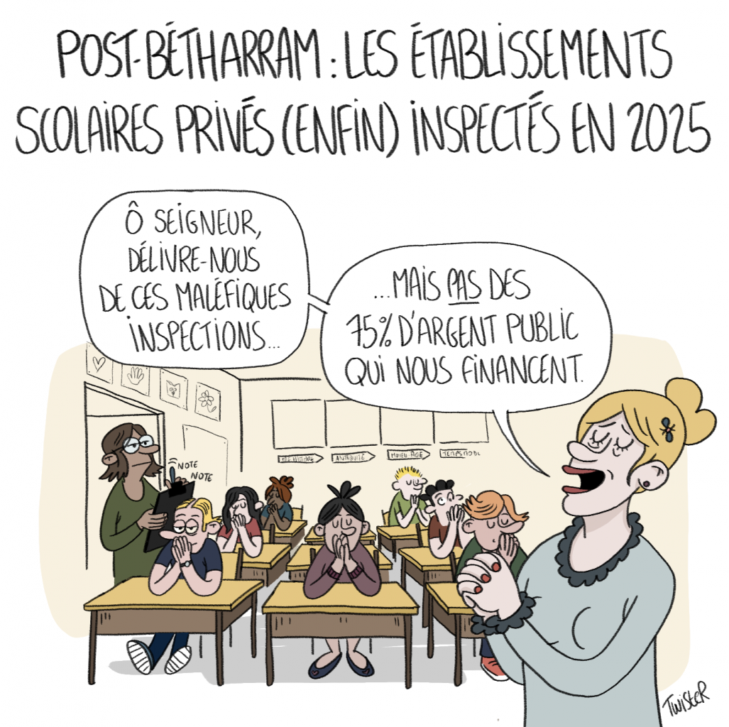 Mordant, décalé et toujours drôle. Chaque semaine, la dessinatrice Twister pose son regard sur une publication de Mediacités. Cette fois-ci : nos révélations sur les rapports d'inspection menés en 2025 dans les établissements d'enseignement privé, dans le sillage de l'affaire Bétharram.