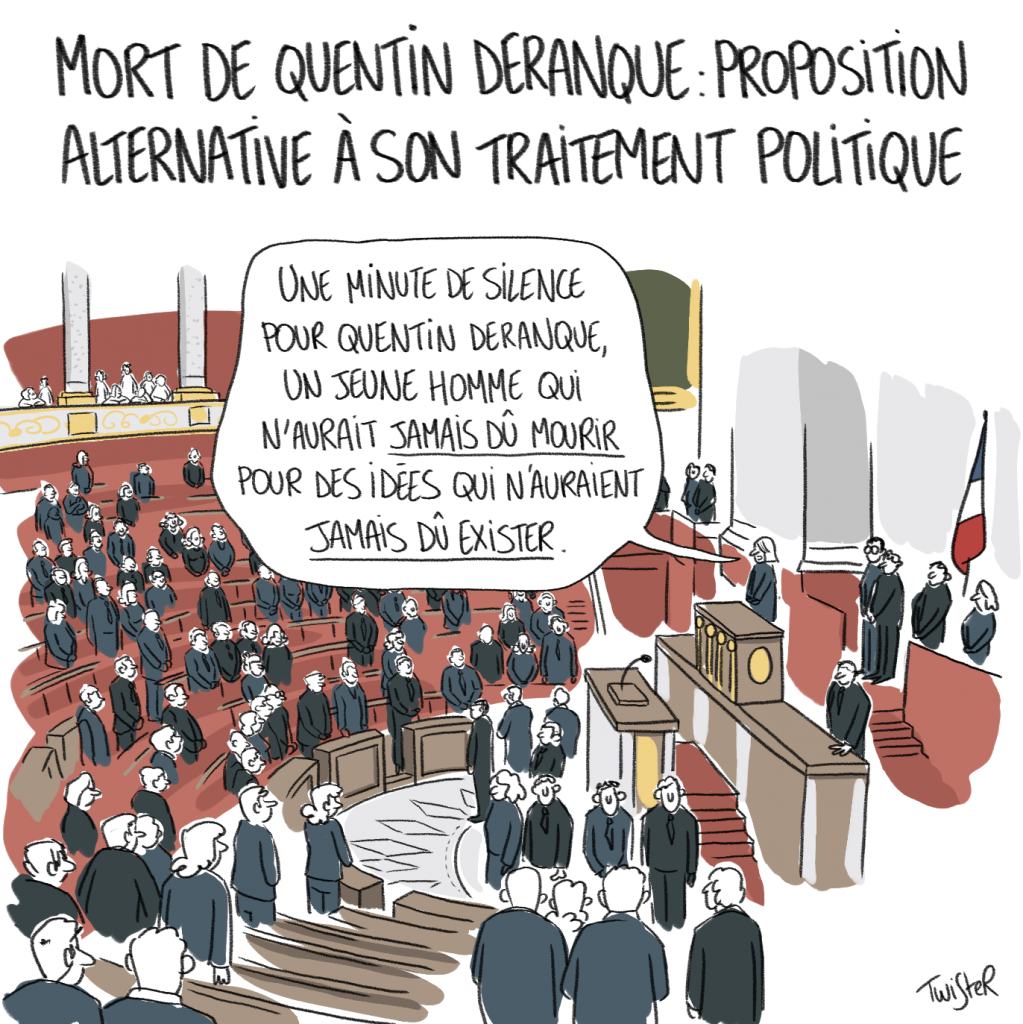 Alors que ce samedi, nombre de groupuscules d’ultradroite de toute la France s’apprête à se réunir à Lyon pour une marche en hommage à Quentien Deranque, plus tôt dans la semaine, le 17 février, à la demande du député d’extrême droite Eric Ciotti (groupe UDR), l’Assemblée nationale a observé une minute de silence en mémoire du jeune homme. C’est sur ce moment particulier que revient notre dessinatrice Twister.