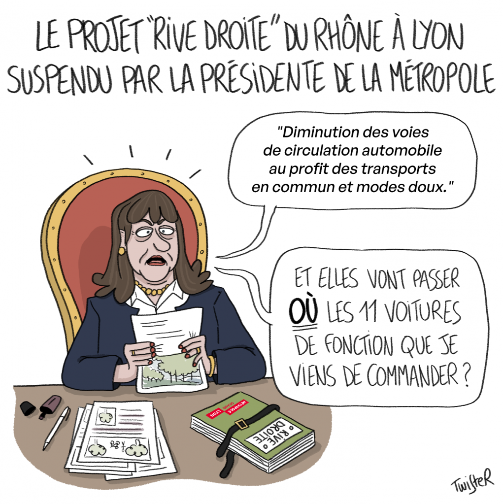 Mordant, décalé et toujours drôle. Chaque semaine, la dessinatrice Twister pose son regard sur une publication de Mediacités ou une autre actualité locale... ou les deux. Cette semaine, retour sur le projet « Rive droite » et les voitures de fonction de la Métropole.